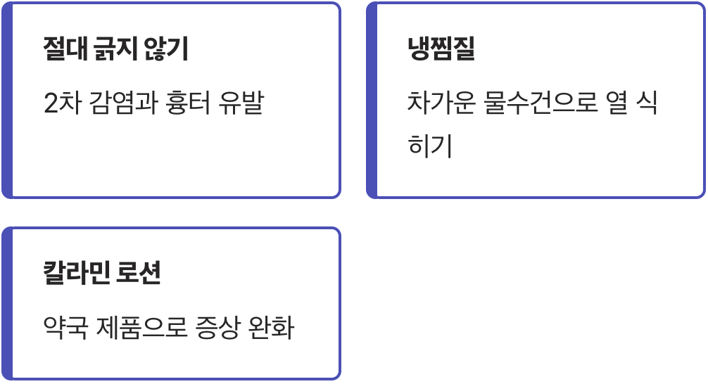 초기 대응 시기를 놓쳤다면, 이제 본격적으로 끔찍한 가려움과의 싸움이 시작됩니다. 이때 가장 중요한 원칙은 ‘절대로 긁지 않는다’는 것입니다. 긁는 행위는 피부 장벽을 손상시켜 2차 세균 감염을 유발하고, 흉터를 남기는 지름길입니다.