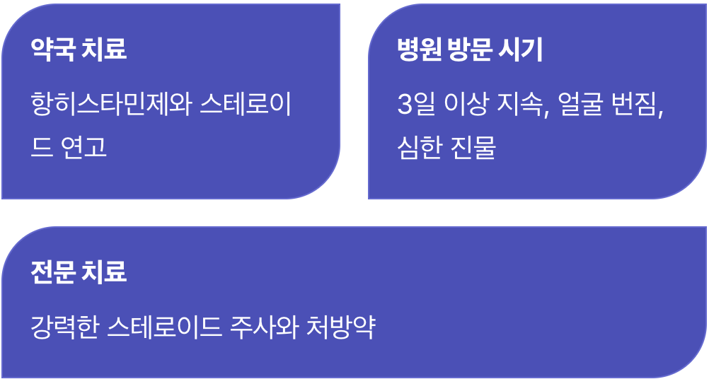 자가 치료 후 증상 악화 시 병원 방문해 전문적인 약물치료(경구 스테로이드, 항히스타민제 등)를 받는 것이 권장됩니다.