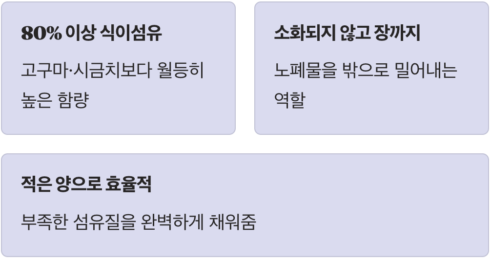 수용성 성분은 변을 부드럽게 만들고 장내 유익균의 먹이가 되어 장 환경을 좋게 만듭니다. 반면 불용성 성분은 장벽을 자극하여 장이 스스로 운동하게 만들고, 장 주름 사이에 끼어있는 오래된 숙변 찌꺼기까지 싹싹 긁어서 배출시킵니다. 마치 물청소와 솔질을 동시에 하는 것과 같아서, 지긋지긋한 변비와 잔변감에서 탈출하고 싶은 분들에게 가장 완벽한 해답이 되어줍니다.