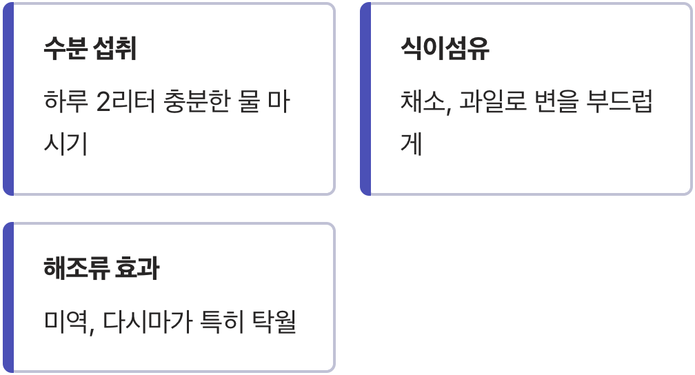 자세가 고속도로를 뚫어주는 역할을 한다면, 그 도로를 달릴 자동차인 대변의 상태도 중요합니다. 아무리 길이 좋아도 차가 고장 나면 달릴 수 없듯이, 변이 너무 딱딱하면 나오기 힘듭니다. 자세 교정과 함께 하루 2리터 정도의 충분한 수분 섭취와 채소, 과일 같은 식이섬유를 꼭 챙겨 드셔야 합니다.