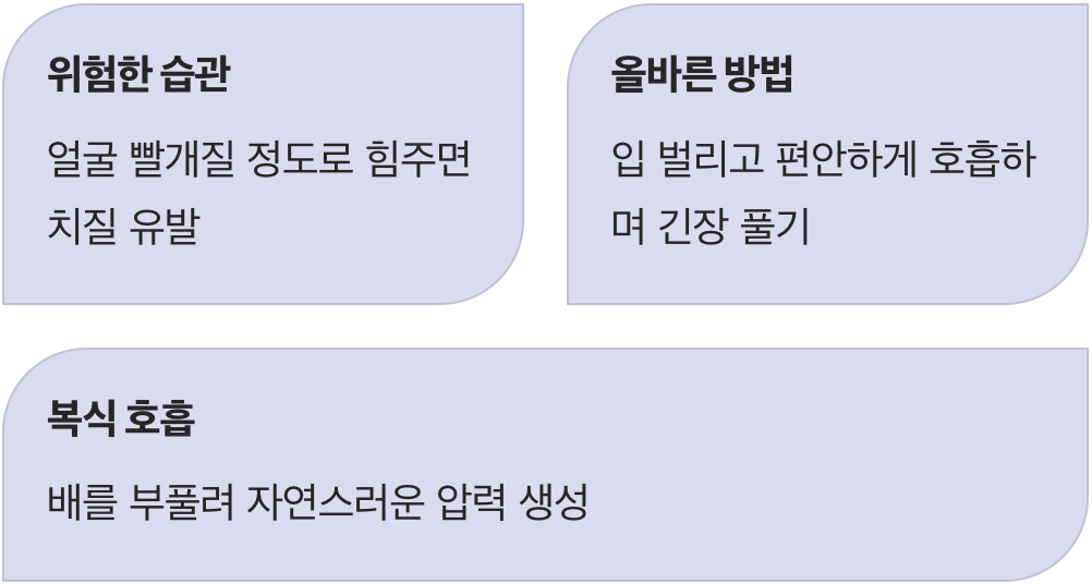 많은 분이 변이 안 나오면 얼굴이 빨개질 정도로 힘을 주곤 합니다. 하지만 숨을 참고 강하게 힘을 주는 행동은 오히려 항문 주변의 혈압을 높여 치질을 유발하거나 증상을 악화시킬 수 있습니다. 통로가 막혀 있는데 억지로 밀어내려고 하니 몸에 무리가 가는 것은 당연한 이치입니다.