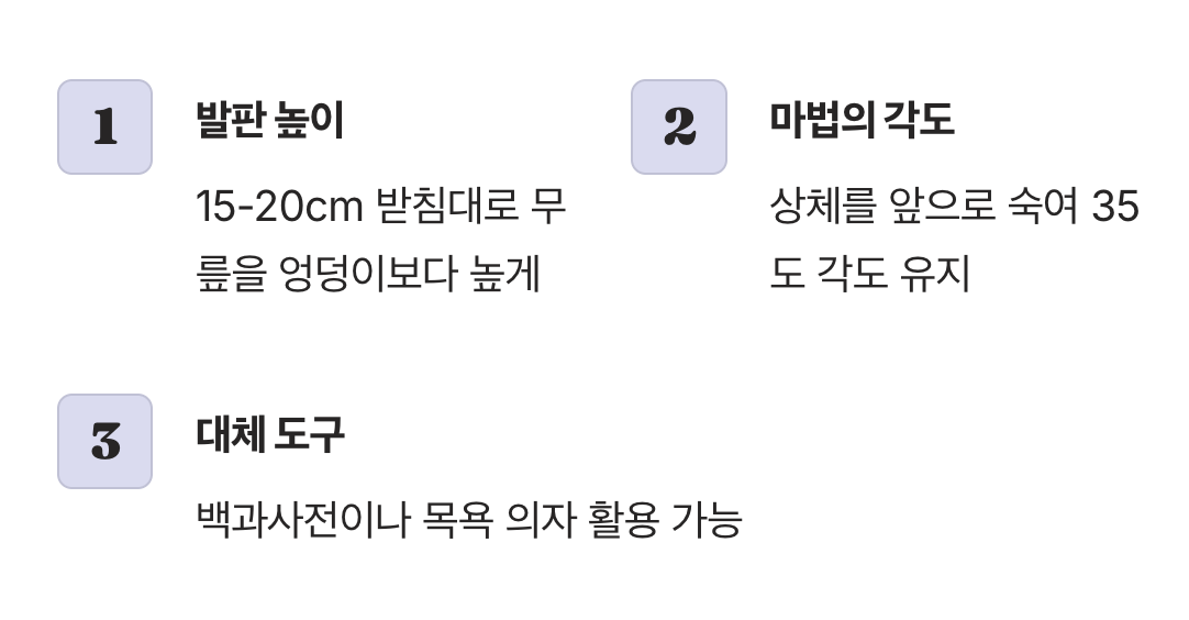 A. 전용 발판이 없다면 까치발을 들어 무릎 높이를 올리는 것도 임시방편이 될 수 있습니다. 또는 허리를 최대한 숙여서 가슴이 무릎에 닿을 정도로 몸을 접는 것도 치골직장근을 이완시키는 데 도움을 줍니다. 하지만 안정적인 자세 유지를 위해 집에 있는 세숫대야나 두꺼운 책을 받침대로 활용하는 것을 가장 추천합니다.