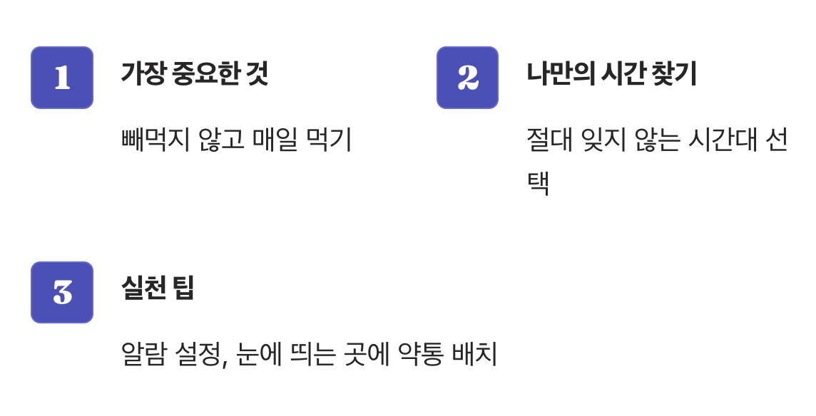 사실 약을 언제 먹느냐보다 백 배 더 중요한 것은 '빼먹지 않고 매일 먹는 것'입니다. 아무리 좋은 시간대라도 자꾸 까먹는다면 아무 소용이 없습니다. 혈액순환 개선제는 하루 이틀 먹어서 효과를 보는 것이 아니라, 꾸준히 혈관 속에 유효 성분을 채워줘야 하기 때문입니다. 그래서 저는 본인의 생활 패턴 중에서 절대 잊어버리지 않는 시간을 고르는 것을 첫 번째 해결책으로 제시합니다.