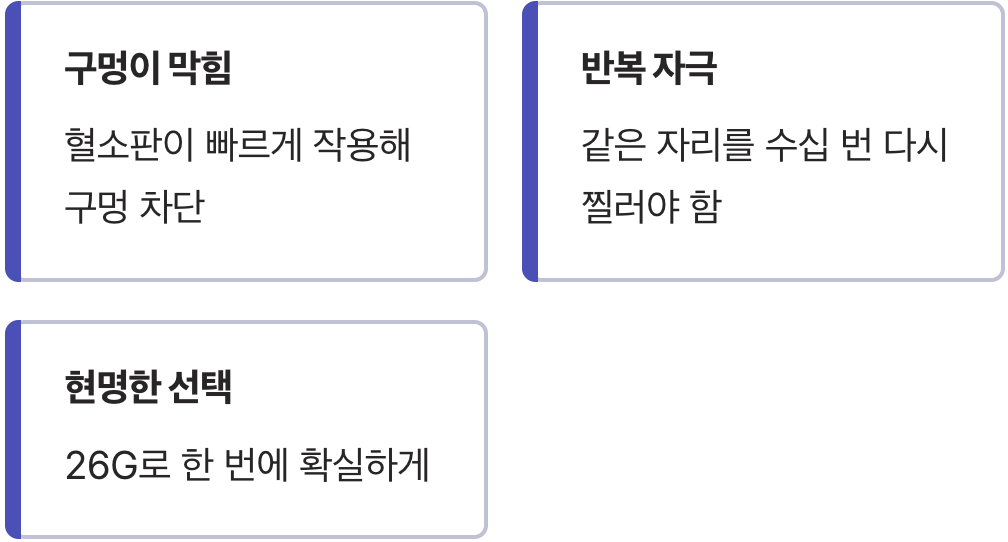 한 번에 확실하게 끝내는 것이 피부 손상도 줄이고 전체적인 통증도 줄이는 가장 현명한 해결책입니다. 약간의 따끔함을 감수하더라도 적당한 두께의 26G 정도를 사용해 보세요. 한두 번의 터치만으로도 충분한 효과를 볼 수 있어 결과적으로는 피부에 가해지는 스트레스가 훨씬 줄어듭니다.