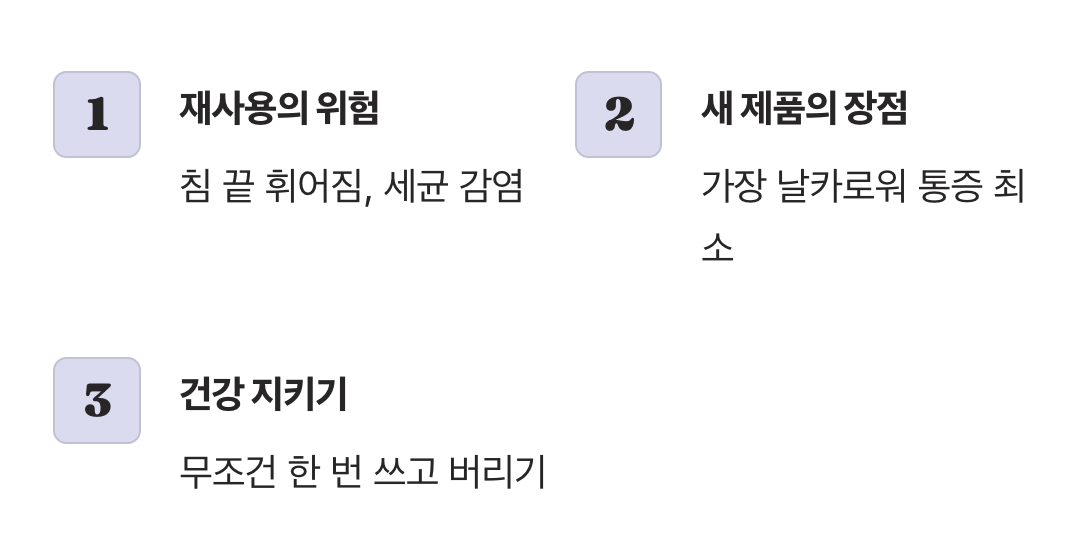 내 몸을 위해 하는 행위가 독이 되지 않으려면 아깝다 생각 말고 무조건 한 번 쓰고 버려야 합니다. 멸균된 새 제품을 사용할 때 바늘 끝이 가장 날카로워 통증이 가장 적습니다. 항상 새것을 사용하는 원칙을 지키는 것이야말로 건강을 지키는 마지막이자 최고의 비법입니다.