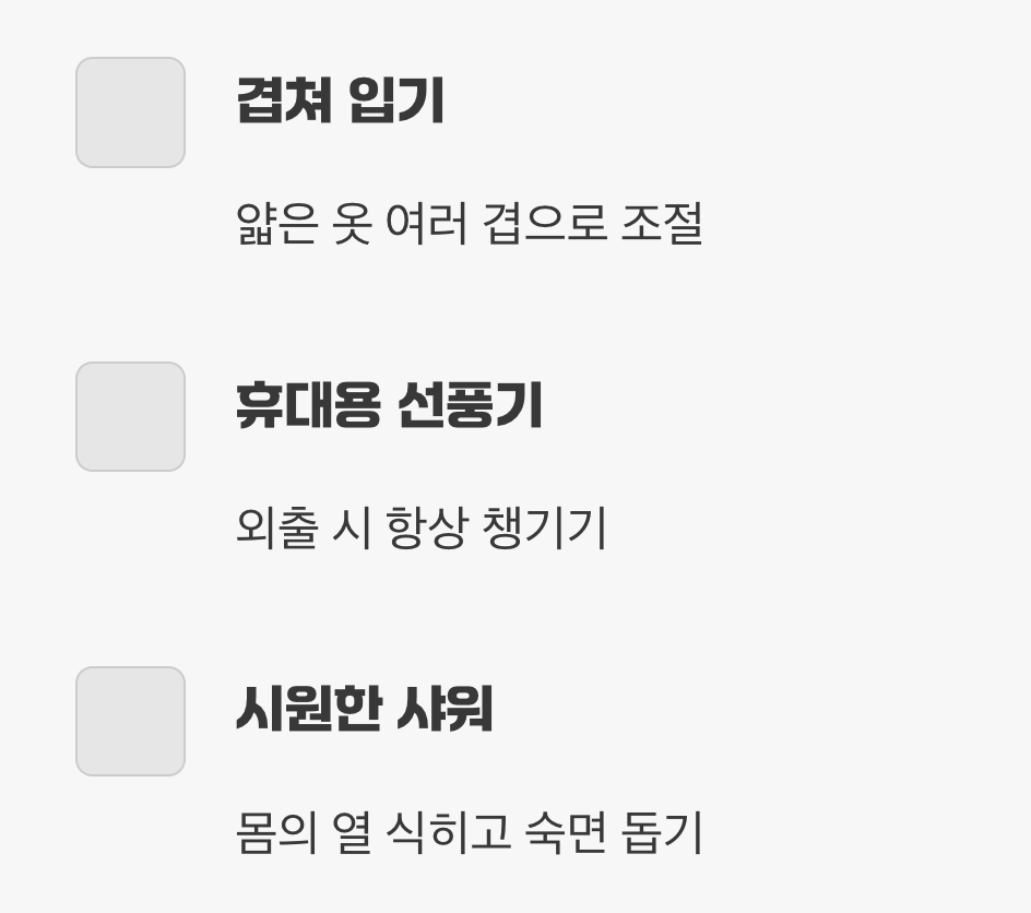 음식 조절과 함께, 일상생활 속에서 체온을 시원하게 유지하려는 노력이 동반될 때 그 효과는 배가 됩니다. 갑작스럽게 열이 확 오를 때, 당황하지 않고 대처할 수 있는 나만의 방법을 미리 준비해 두는 것이 중요합니다.