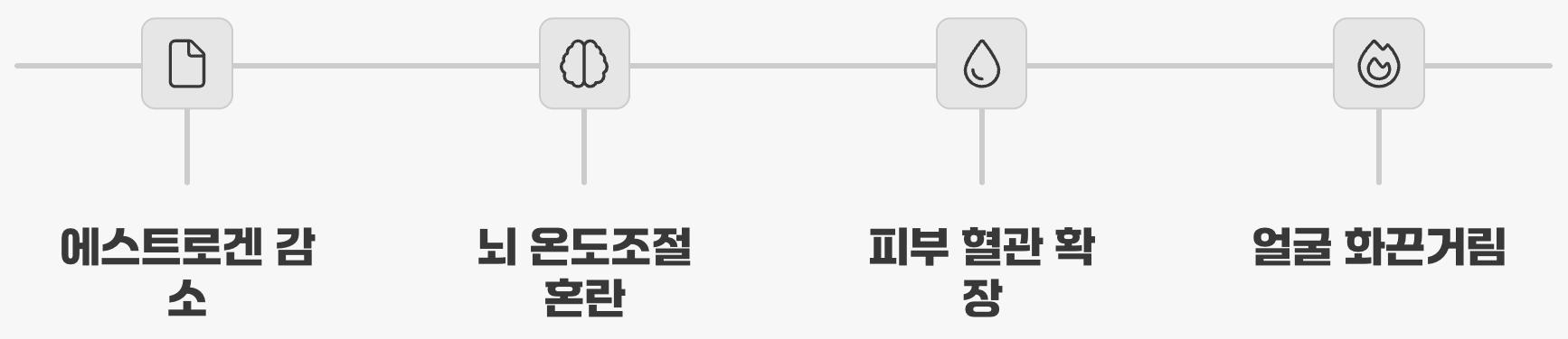 안면홍조는 왜 생기는 걸까요? 이는 우리 몸의 여성호르몬인 ‘에스트로겐’이 급격히 줄어들면서, 뇌에서 체온을 조절하는 시스템이 혼란에 빠지기 때문입니다. 마치 온도 조절 센서가 고장 난 보일러처럼, 우리 뇌는 덥지 않은데도 덥다고 착각하여 몸의 열을 식히기 위해 피부 혈관을 갑자기 확장시킵니다. 이 과정에서 얼굴이 붉어지고 화끈거리는 열감이 느껴지는 것이죠.
