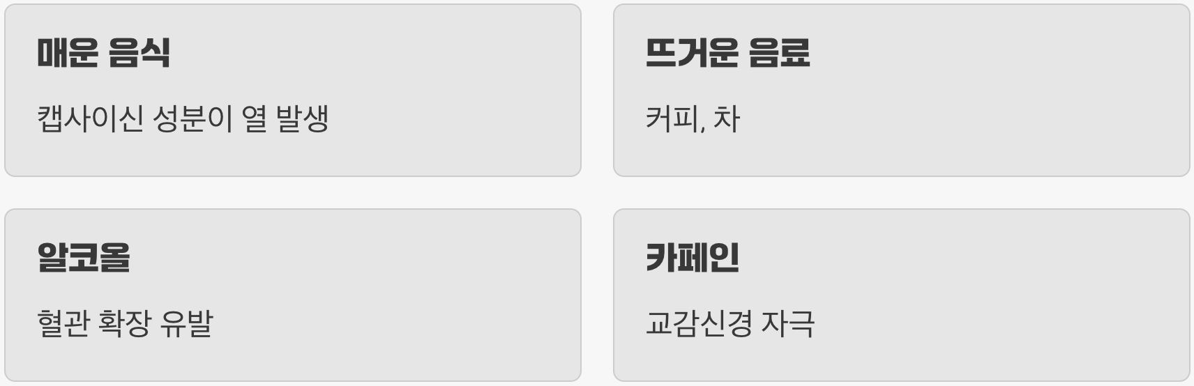 몸에 좋은 음식을 챙겨 먹는 것만큼 중요한 것이, 안면홍조를 악화시키는 음식을 피하는 것입니다. 특정 음식들은 우리 몸의 체온을 직접적으로 올리거나, 교감신경을 자극하여 혈관을 확장시키기 때문에, 불난 집에 부채질하는 것과 같은 역할을 합니다.