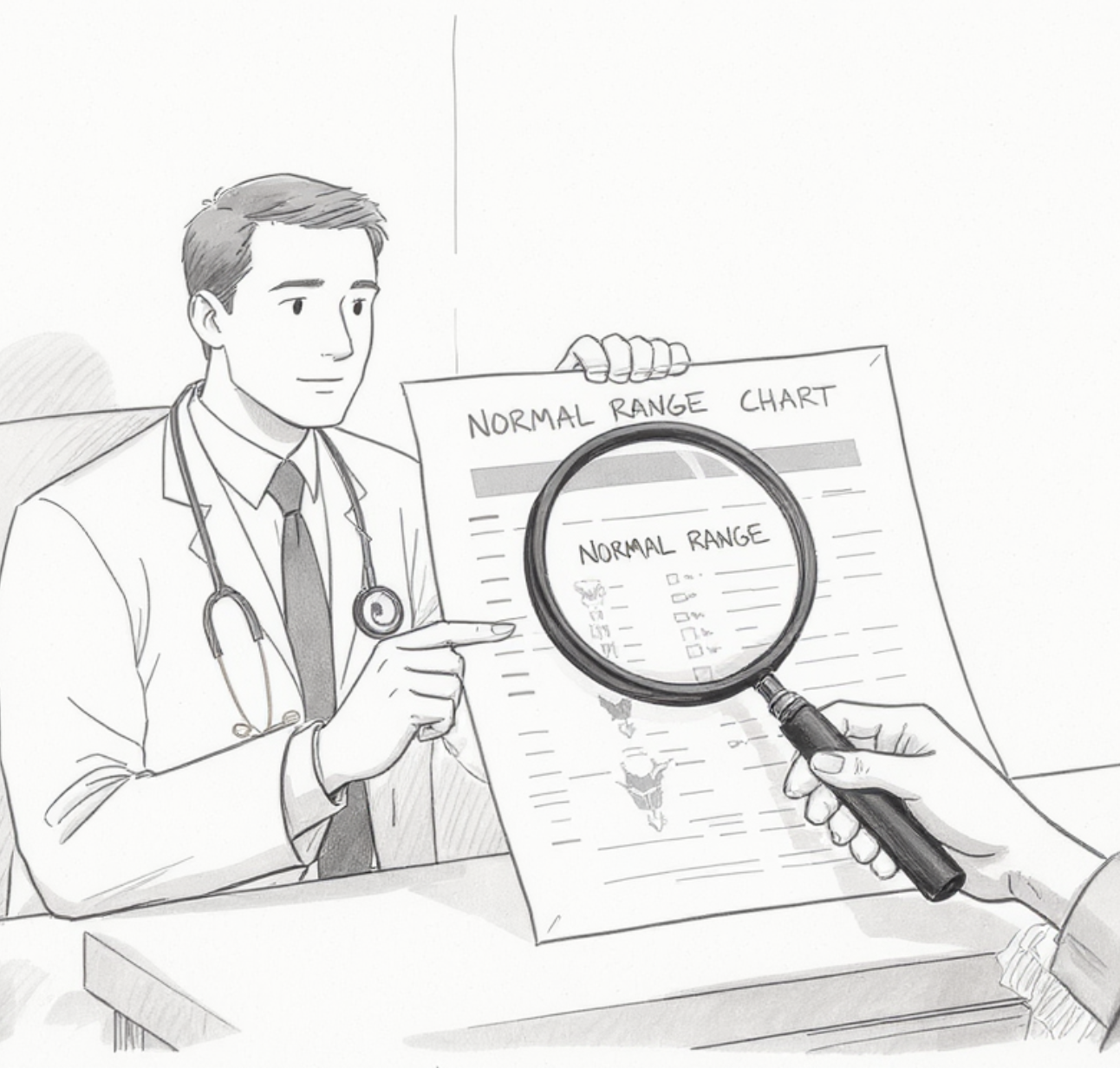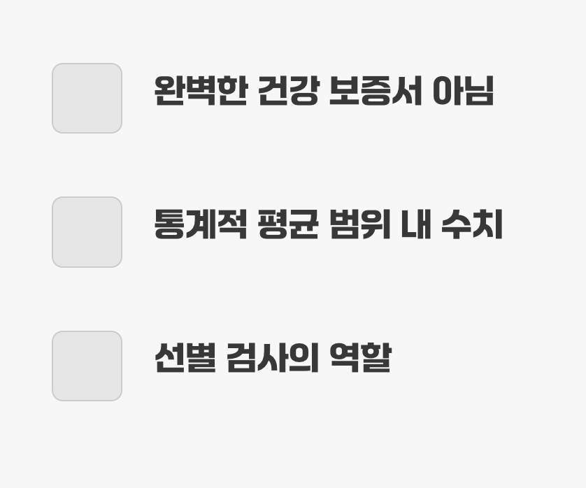 우리가 결과표에서 마주하는 ‘정상’이라는 단어의 진짜 의미를 알아야 합니다. 이는 ‘당신은 완벽하게 건강합니다’라는 뜻이 아닙니다. 보다 정확하게는, “현재 시행한 검사 항목들의 수치가, 통계적으로 건강한 사람들의 평균 범위 안에 포함됩니다”라는 의미에 가깝습니다.
