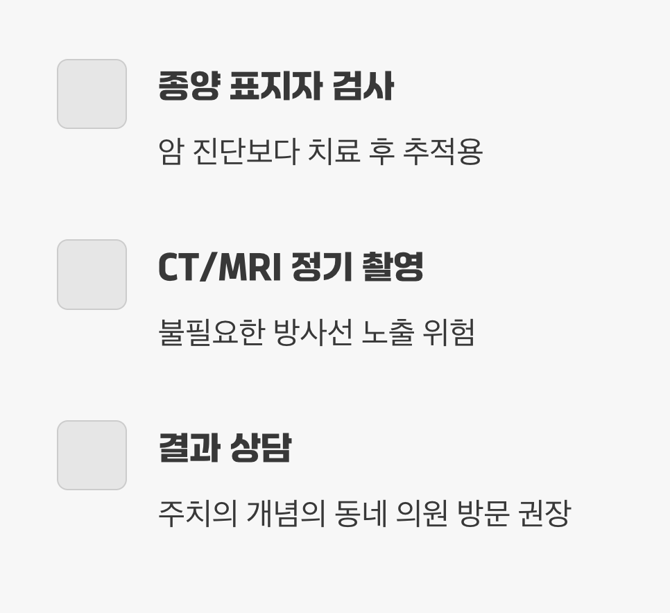 특히 성장 속도가 매우 빠른 일부 공격적인 암의 경우, 검진과 검진 사이의 ‘공백기’에 발생하여 늦게 발견되기도 합니다. 따라서 정기적인 검진만큼이나 중요한 것은, 검진 결과가 정상이더라도 내 몸이 보내는 작은 이상 신호(급격한 체중 감소, 원인 모를 통증, 소화불량 등)에 귀를 기울이고, 이상이 느껴질 때는 주저 없이 병원을 찾는 것입니다.