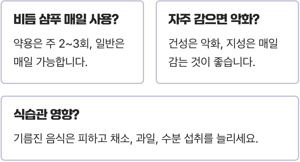 A. 샴푸의 성분에 따라 다릅니다. 항진균 성분이 들어간 약용 샴푸의 경우, 주 2~3회 사용하는 것이 일반적이며 매일 사용 시 두피에 자극이 될 수 있습니다. 일반적인 지성 두피용 샴푸나 건성용 보습 샴푸는 매일 사용해도 괜찮습니다. 제품 설명서를 꼭 확인해 보세요.