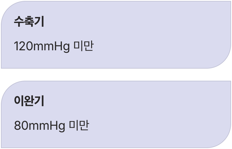 우리 몸의 혈관이 가장 편안하고 이상적인 상태에 있음을 알려주는 초록불 신호는 바로 ‘수축기 120mmHg 미만 그리고(&) 이완기 80mmHg 미만’입니다. 대한고혈압학회에서 제시하는 이 기준은, 심장이 무리하지 않으면서도 우리 몸 구석구석까지 혈액을 원활하게 공급하고 있다는 가장 건강한 상태를 의미합니다.
