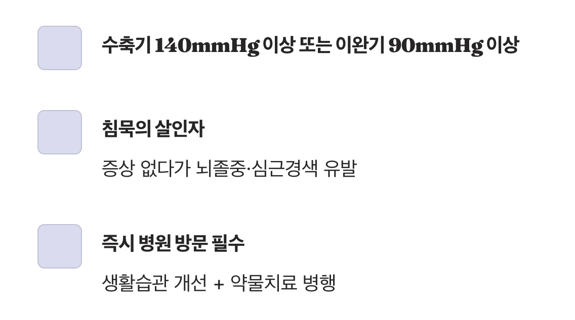 만약 혈압계의 숫자가 ‘수축기 140mmHg 이상 또는(or) 이완기 90mmHg 이상’을 지속적으로 가리킨다면, 이는 즉시 전문가의 도움이 필요한 ‘빨간불’ 신호, 즉 ‘고혈압’입니다. 고혈압이 무서운 이유는, 그 자체로는 별다른 증상이 없다가 어느 날 갑자기 뇌졸중이나 심근경색 같은 치명적인 합병증을 일으키는 ‘침묵의 살인자’이기 때문입니다.