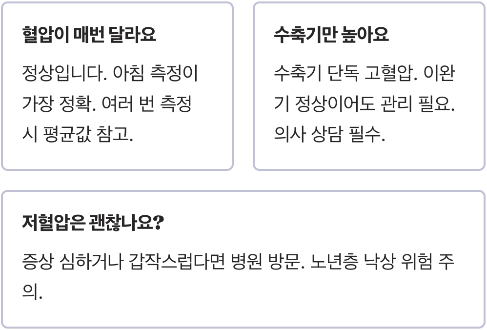 A. 혈압은 측정하는 시간, 몸의 상태, 감정 등에 따라 수시로 변하는 것이 정상입니다. 가장 정확한 혈압은 아침에 일어나 소변을 본 뒤, 1~2분간 안정을 취한 상태에서 측정하는 것입니다. 하루 중 다른 시간대에 여러 번 측정했다면, 그 평균값을 자신의 혈압으로 생각하는 것이 좋습니다.