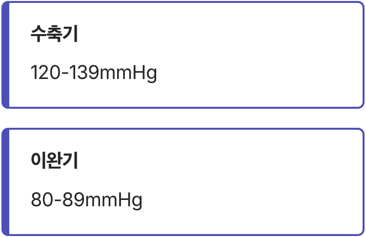 이제부터는 주의 깊게 살펴봐야 할 노란불 신호입니다. 수축기 혈압이 120~139mmHg 사이거나, 이완기 혈압이 80~89mmHg 사이에 해당된다면, 우리는 이를 ‘고혈압 전단계’ 또는 ‘주의 혈압’이라고 부릅니다. 이는 아직 질병은 아니지만, 빨간불인 ‘고혈압’으로 나아가기 직전의 매우 중요한 경고 신호입니다.
