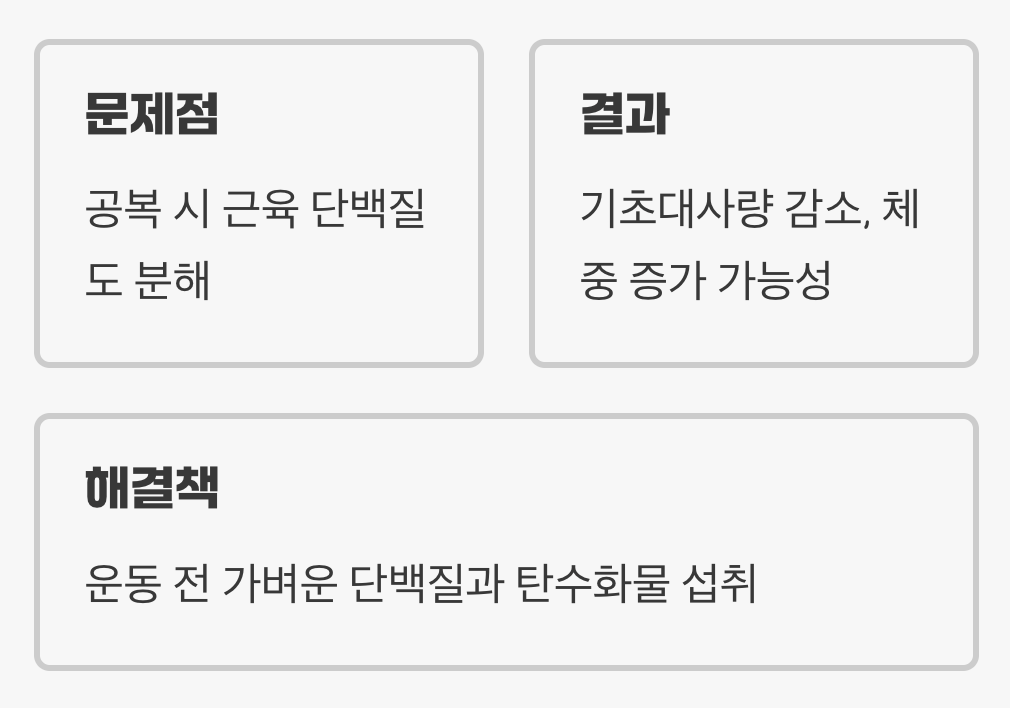 이는 애써 만든 소중한 근육이 함께 사라지는, ‘근손실’을 유발할 수 있습니다. 근육량이 줄어들면 기초대사량이 낮아져, 장기적으로는 오히려 살이 더 쉽게 찌는 체질로 변할 수 있습니다. 체지방 감량과 함께 근육량 유지를 원한다면, 운동 전 바나나 반 개나 단백질 셰이크 같은 가벼운 탄수화물과 단백질을 섭취하여 근육이 분해되는 것을 막아주는 것이 현명합니다.
