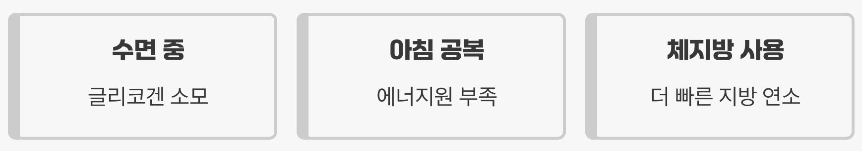 공복 유산소 운동이 체지방 감량에 효과적인 이유는 우리 몸의 에너지 사용 순서에 있습니다. 우리가 잠을 자는 동안, 전날 섭취한 탄수화물 에너지원인 ‘글리코겐’이 대부분 소모됩니다. 이런 상태에서 아침에 운동을 시작하면, 우리 몸은 부족한 글리코겐 대신, 다음 에너지원인 ‘체지방’을 더 빨리 꺼내어 사용하기 시작합니다.