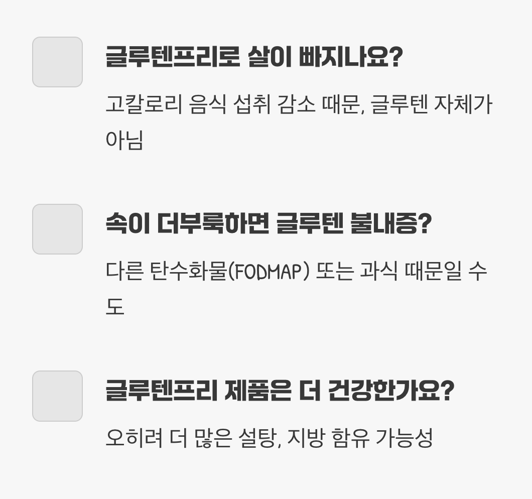 많은 분이 글루텐프리 식단을 시작하는 가장 큰 이유는 바로 ‘다이어트 효과’에 대한 기대 때문입니다. 실제로 글루텐을 끊고 살이 빠졌다는 사람들도 많죠. 하지만 이는 글루텐을 피해서가 아니라, 글루텐이 든 ‘음식’을 피했기 때문일 가능성이 높습니다.