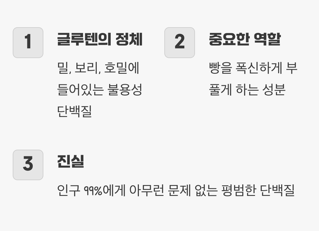 많은 분이 글루텐 자체를 몸에 해로운 독소처럼 오해하지만, 이는 사실이 아닙니다. 전 세계 인구의 99%에게 글루텐은 아무런 문제를 일으키지 않는, 그저 평범한 단백질일 뿐입니다. 문제는 글루텐 자체가 아니라, 일부 사람들의 몸이 이 단백질에 특별하게 반응하는 것입니다.