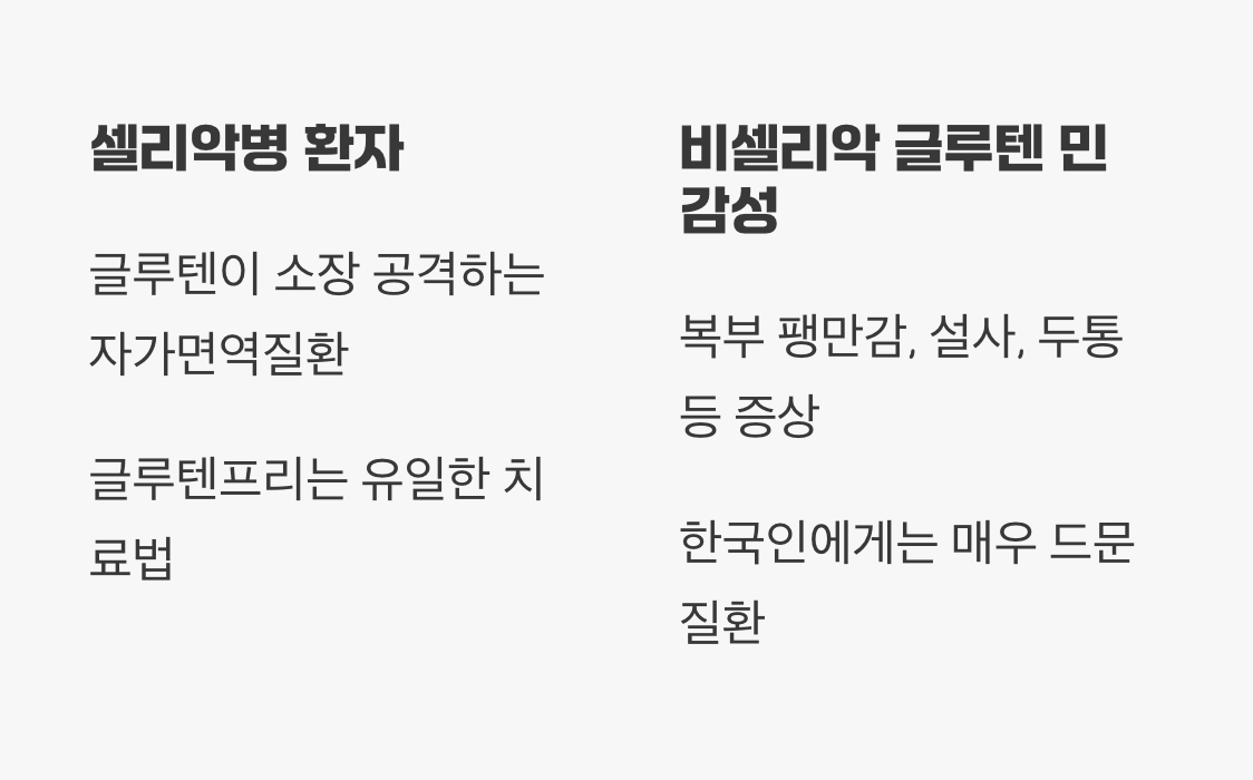 또한, 셀리악병은 아니지만 글루텐을 섭취했을 때 복부 팽만감, 설사, 두통, 피로감 같은 불편한 증상을 겪는 ‘비(非)셀리악 글루텐 민감성’을 가진 사람들도 있습니다. 이런 분들 역시 글루텐을 제한하는 식사를 통해 삶의 질을 크게 향상시킬 수 있습니다. 하지만 이 두 경우는 전체 인구에서 극히 일부에 해당하며, 특히 한국인에게 셀리악병은 매우 드문 질환으로 알려져 있습니다.