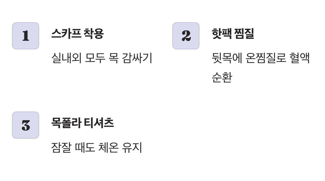 '감기는 뒷목으로 들어온다'는 옛말이 있듯이, 목 부위의 체온 관리는 감기 치료의 핵심입니다. 목이 차가운 바람에 노출되면 혈관이 수축하고 면역력이 떨어집니다. 외출할 때는 물론이고 실내에 있을 때도 얇은 스카프나 손수건을 목에 둘러주세요. 잘 때도 목을 감싸고 자면 체온이 유지되어 기침 발작이 줄어드는 것을 느낄 수 있습니다.