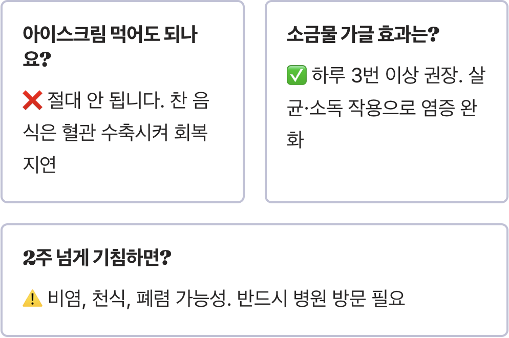 A. 네, 아주 큰 도움이 됩니다. 따뜻한 물에 소금을 녹여서 하루 3번 이상 가글을 해주세요. 소금의 살균 작용이 목 안의 염증을 소독해 주고 붓기를 빼주는 역할을 합니다. 단, 너무 진한 소금물은 점막을 자극할 수 있으니 짭짤한 국물 정도의 농도로 맞추는 것이 좋습니다.