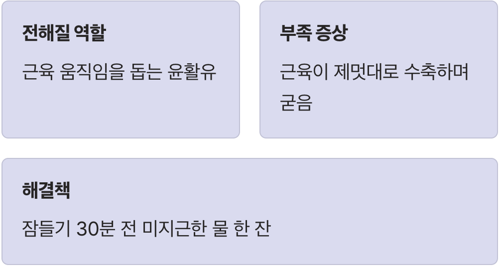우리 몸은 전기가 통하는 물주머니와 같습니다. 땀을 많이 흘리거나 물을 적게 마시면 몸속에 있는 수분과 나트륨, 칼륨 같은 '전해질'이 빠져나갑니다. 전해질은 근육이 부드럽게 움직이도록 돕는 윤활유 역할을 하는데, 이것이 부족하면 근육이 제멋대로 수축하며 딱딱하게 굳어버립니다.