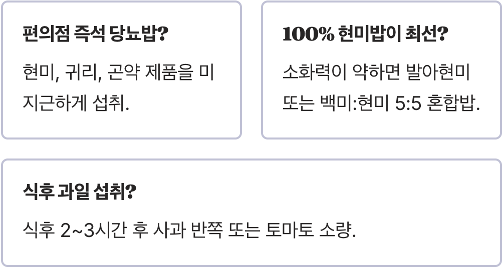 A. 네, 요즘 나오는 즉석밥 제품들도 성분이 아주 훌륭합니다. 현미나 귀리, 곤약이 섞인 제품을 고르시면 됩니다. 다만 즉석밥은 따뜻할 때 먹으면 전분이 빨리 흡수될 수 있으니, 전자레인지에 데운 후 살짝 식혀서 미지근할 때 드시는 것이 저항성 전분을 늘려 혈당 관리에 더 유리합니다.