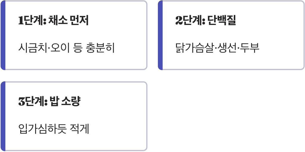 따라서 밥의 종류를 바꾸는 것보다 더 중요한 해결책은 '반찬의 구성'을 바꾸는 것입니다. 밥을 드시기 전에 닭가슴살, 생선, 두부 같은 단백질 반찬과 시금치, 오이 같은 채소 반찬을 먼저 충분히 드세요. 밥은 식사의 마지막 단계에서 입가심하듯이 적게 드셔야 합니다. 채소와 단백질이 위장에 먼저 들어가 방어막을 쳐주면, 어떤 밥이 들어와도 혈당이 튀는 것을 막아줄 수 있습니다.