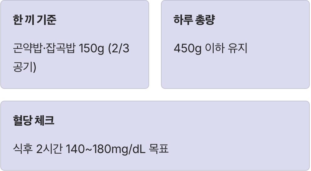 개인마다 활동량이 다르기 때문에 내 몸에 맞는 양을 찾는 것이 중요합니다. 식사 2시간 후에 혈당을 재보고 수치가 140~180mg/dL 사이로 안정적이라면 그 양을 유지하세요. 만약 수치가 높다면 다음 식사 때는 밥을 두 숟가락 정도 덜어내야 합니다. 저울을 하나 사서 내가 먹는 밥의 무게를 직접 재보는 것이 가장 정확하고 확실한 관리 방법입니다.