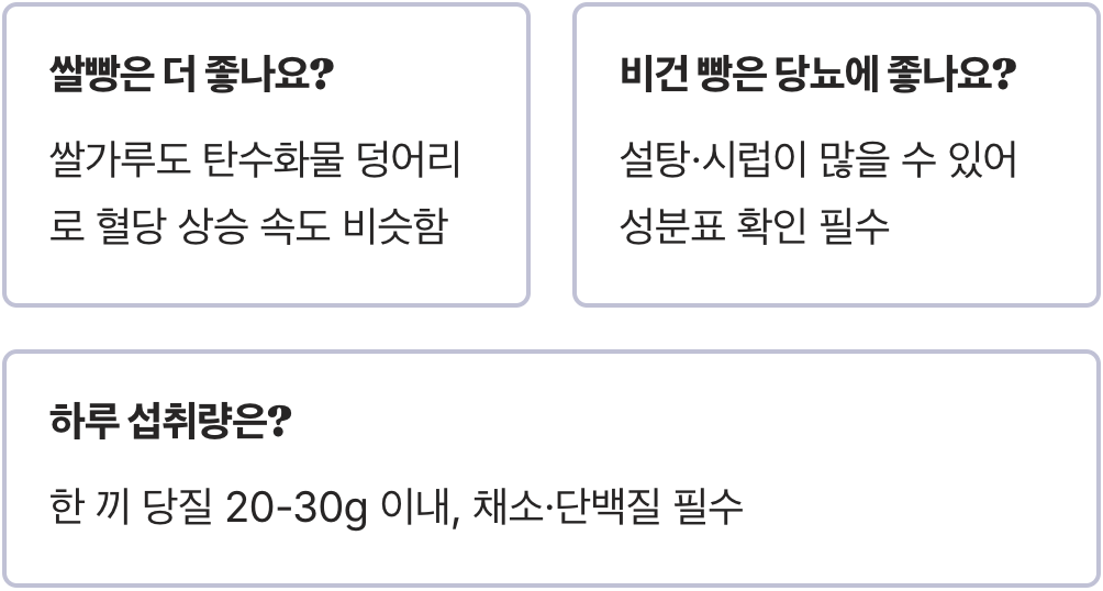 A. 개인의 혈당 조절 능력에 따라 다르지만, 보통 한 끼 식사 대용으로 당질 20~30g 이내(통밀 식빵 1~2쪽, 모닝빵 2개 정도)를 권장합니다. 간식으로는 드시지 않는 것이 좋으며, 식사 대용으로 할 때도 채소와 단백질을 꼭 곁들여 드세요.