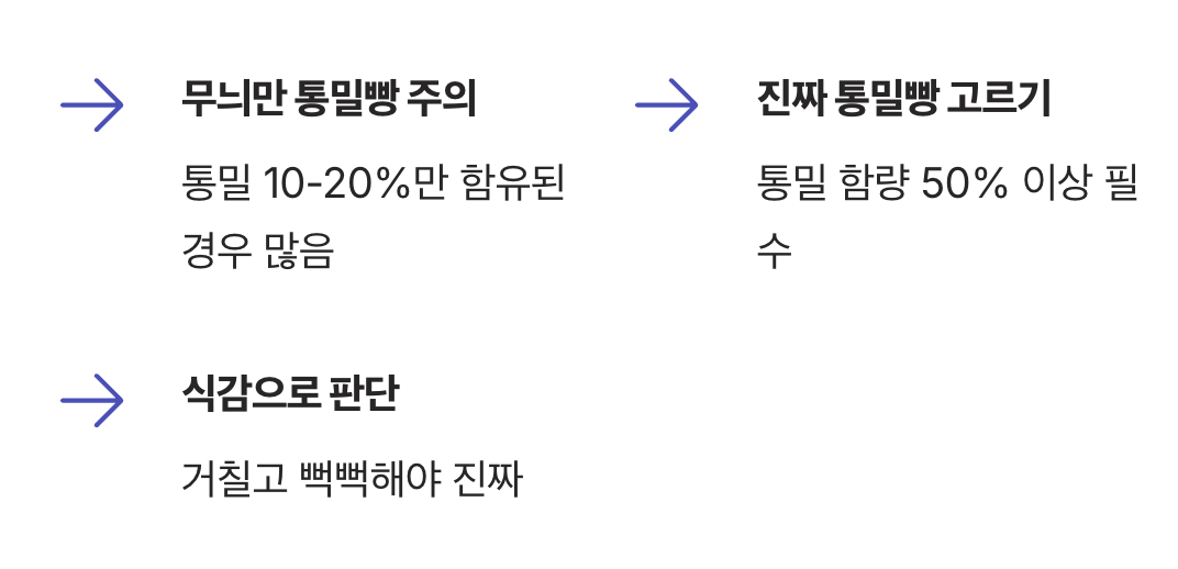 많은 분이 "통밀빵은 건강하니까 괜찮아"라고 생각합니다. 물론 흰 빵보다는 식이섬유가 풍부해서 좋지만, 시중에 파는 통밀빵 중에는 통밀 함량이 10~20%밖에 안 되고 나머지는 일반 밀가루인 경우가 많습니다. '무늬만 통밀빵'에 속지 않으려면 통밀 함량이 최소 50% 이상, 가능하면 100%인 제품을 골라야 합니다.
