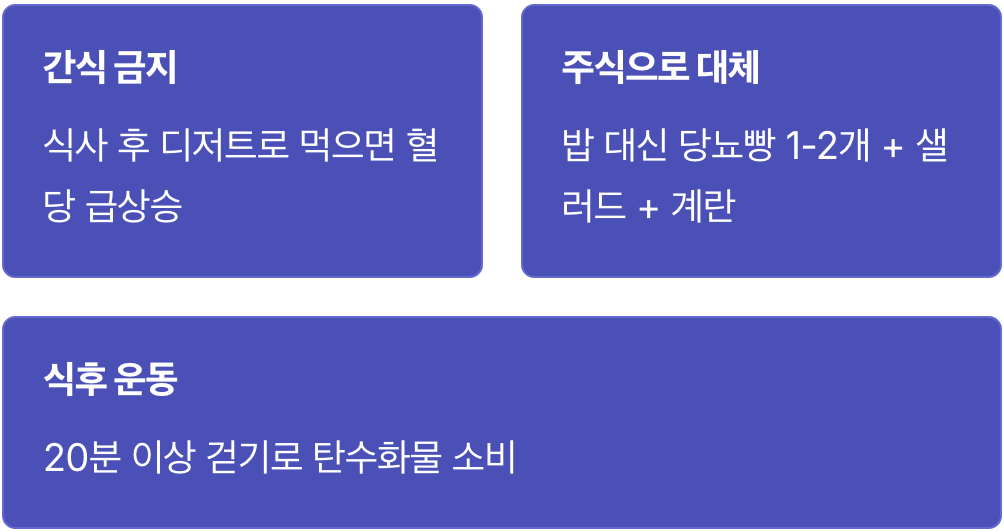 빵을 간식으로 먹는 것은 금물입니다. 식사 후에 디저트로 빵을 먹으면 혈당이 감당할 수 없을 만큼 치솟게 됩니다. 빵을 드시고 싶다면 밥 대신 '주식'으로 드셔야 합니다.