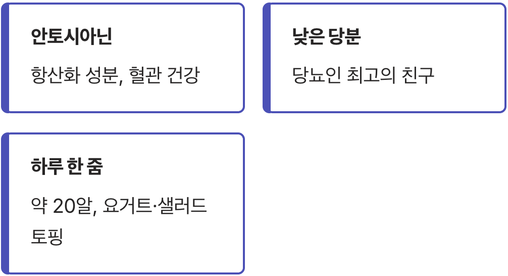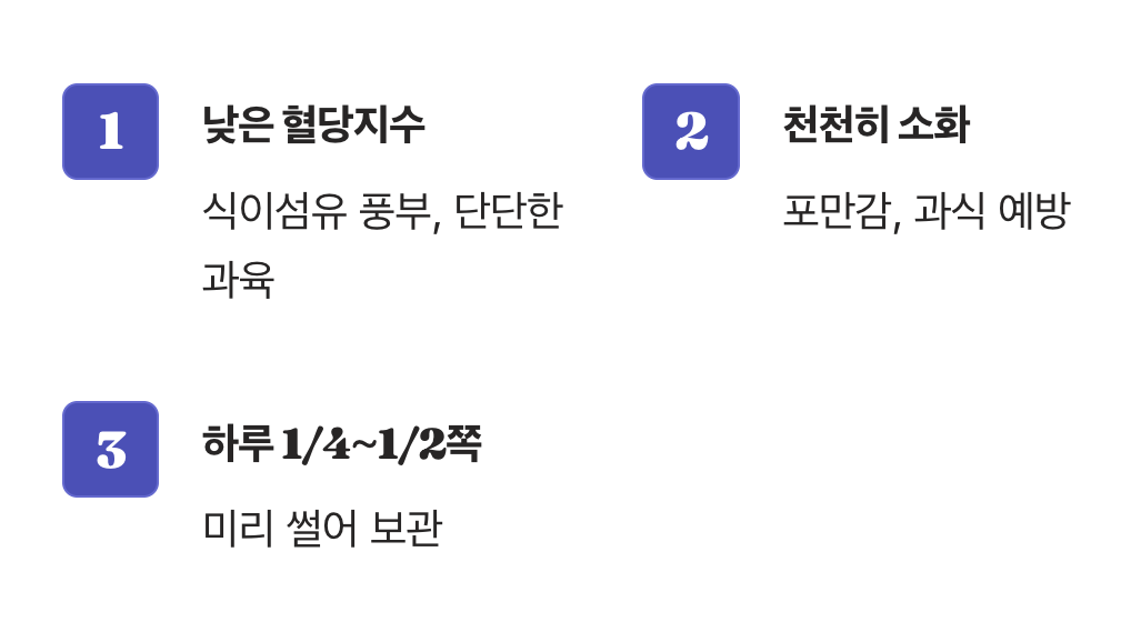 특히 블루베리는 미국 당뇨병 협회에서도 추천하는 슈퍼푸드입니다. 요거트에 섞어 먹거나 샐러드 토핑으로 곁들이면 맛과 영양을 동시에 잡을 수 있습니다. 하루 한 줌 정도(약 20알) 가볍게 즐겨보세요. 달콤한 맛은 그대로 느끼면서 혈당은 안정적으로 유지할 수 있습니다.