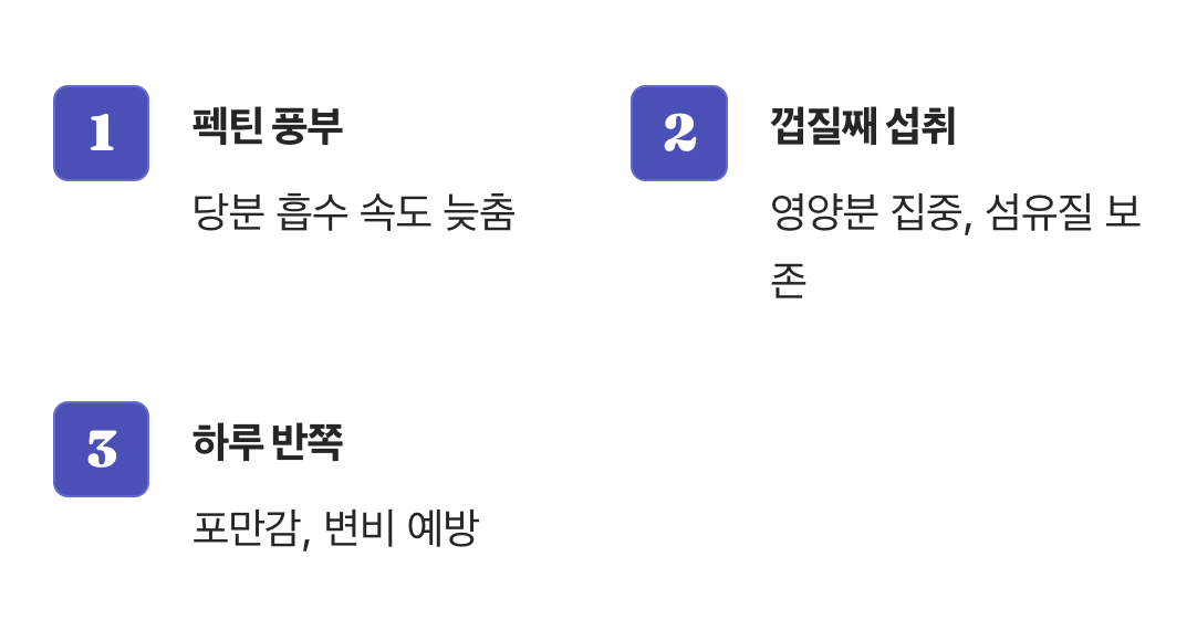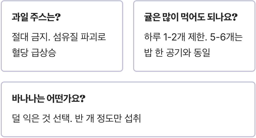 가장 중요한 것은 먹는 시간입니다. 식사 직후에 과일을 먹으면 밥으로 올라간 혈당에 과일 당분까지 더해져 '혈당 스파이크'를 일으킵니다. 식후 2시간 뒤, 점심과 저녁 사이 출출할 때 간식으로 드시는 것이 가장 안전합니다.