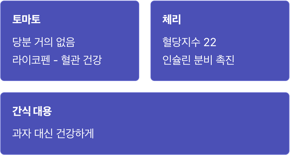 베리류·감귤류·체리·배·사과 등 섬유질 풍부 저혈당 과일이 혈당 조절에 유익하며 통째 먹기 쉬운 점을 장점으로 듭니다.