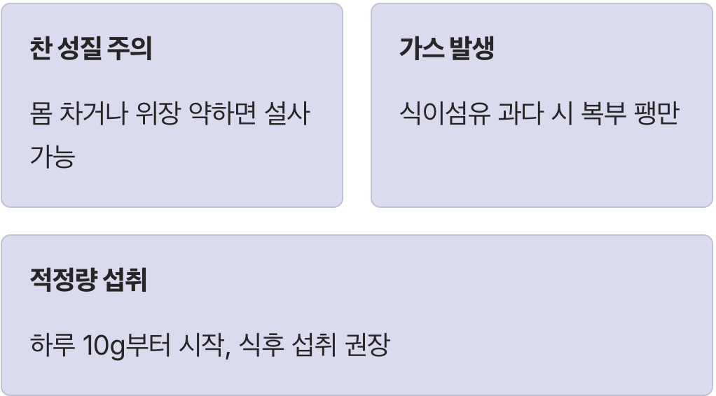 처음에는 하루에 말린 것 기준으로 10g 정도(차 2~3잔)로 시작해서 몸의 반응을 살피며 조금씩 양을 늘려가는 것이 좋습니다. 특히 생으로 드실 때는 공복보다는 식후에 드시는 것이 위장 부담을 줄이는 방법입니다. 내 몸에 맞는 적정량을 찾아 꾸준히 섭취하는 것이야말로 건강을 지키는 가장 지혜로운 태도입니다.