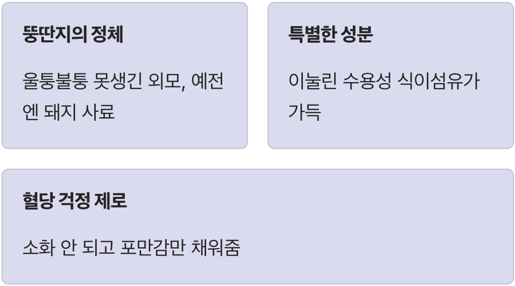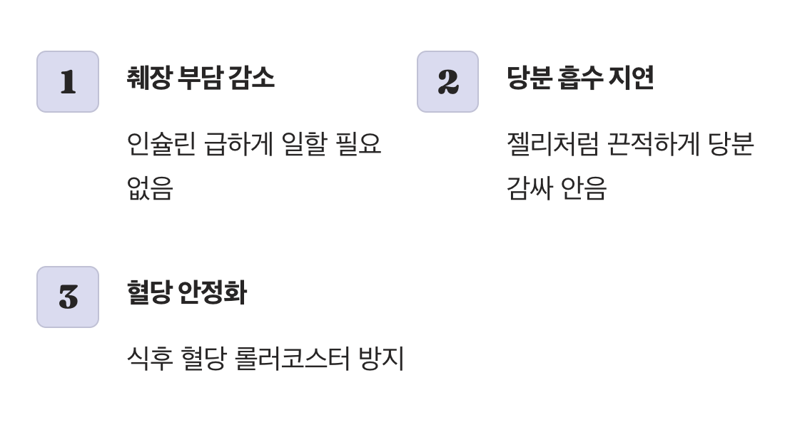 이눌린은 췌장의 부담을 덜어주는 아주 고마운 친구입니다. 우리가 음식을 먹으면 혈당을 낮추기 위해 췌장에서 인슐린이 나오는데, 돼지감자를 먹으면 이눌린이 젤리처럼 끈적하게 변해 장 속의 당분을 감싸 안습니다. 그리고 천천히 흡수되도록 도와주기 때문에 인슐린이 급하게 일할 필요가 없어집니다.