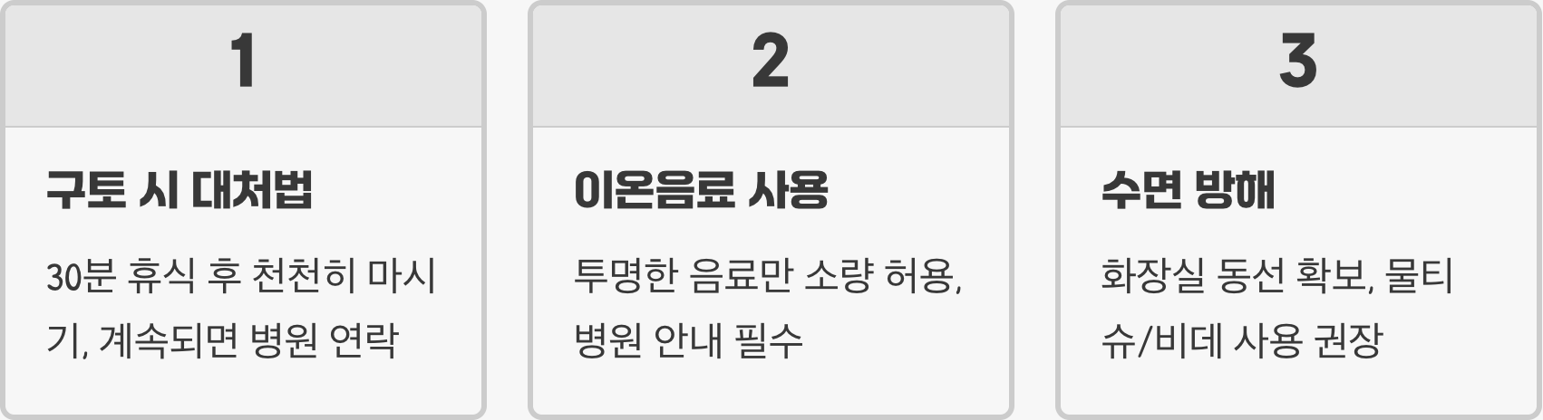 A. 약을 마시는 속도가 너무 빠르거나, 한 번에 너무 많은 양을 마셨을 때 구토를 할 수 있습니다. 이럴 때는 잠시 중단하고 30분 정도 휴식을 취한 뒤, 이전보다 훨씬 더 천천히 마시는 것을 시도해 보세요. 만약 구토가 계속되어 약을 도저히 다 마시지 못했다면, 무리하지 말고 병원에 연락하여 안내를 받아야 합니다.