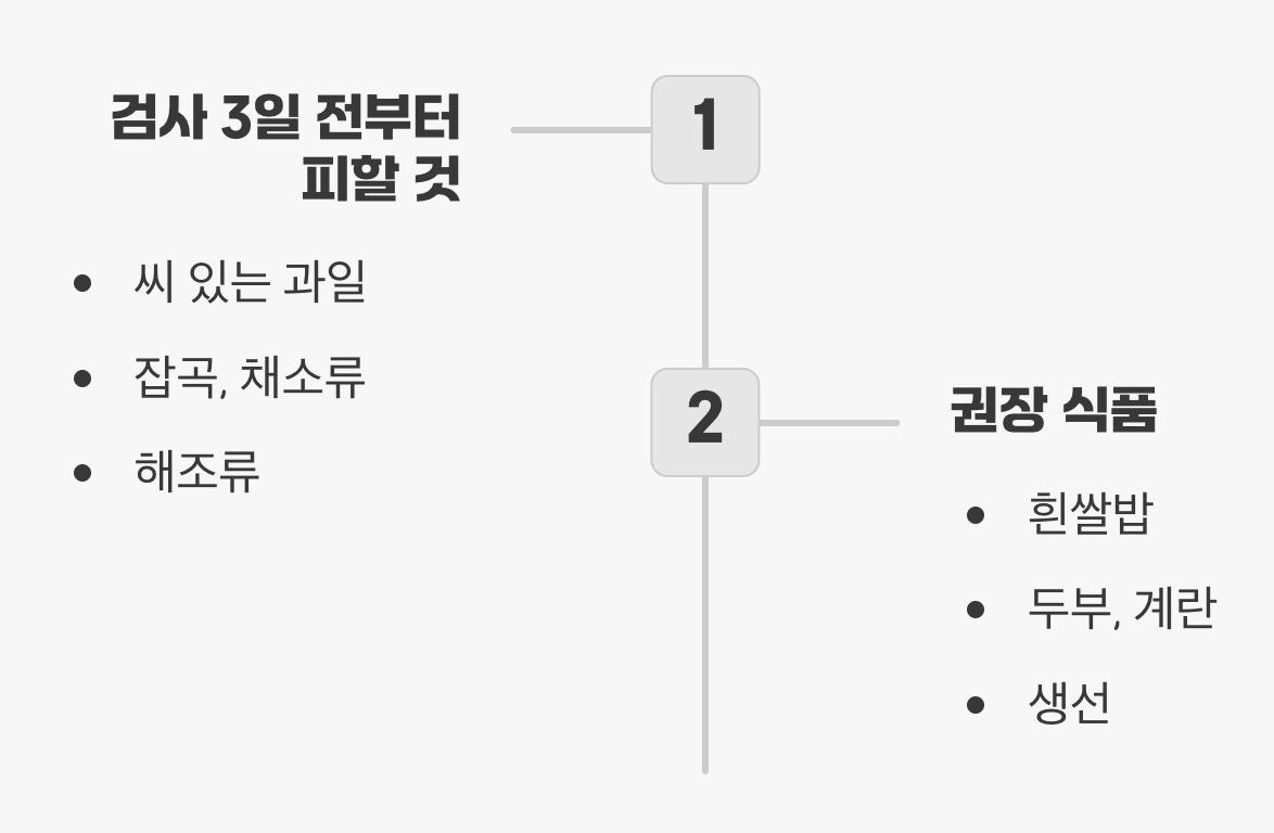 검사 3일 전부터는 씨 있는 과일(참외, 포도, 키위 등), 잡곡, 김치 같은 채소류, 그리고 김이나 미역 같은 해조류 섭취를 반드시 중단해야 합니다. 대신 흰쌀밥, 두부, 계란, 생선처럼 부드럽고 소화가 잘 되는 음식 위주로 식사하는 것이 좋습니다. 이 사전 준비가 바로 약 먹는 고통을 줄여주는 가장 근본적인 해결책입니다.