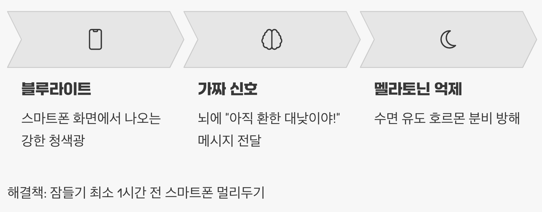 "분명 오래 잤는데 왜 이렇게 피곤하지?"라고 느낀다면, 범인은 잠들기 직전까지 봤던 스마트폰 화면일 가능성이 높습니다. 스마트폰 화면에서 나오는 강한 ‘블루라이트(청색광)’는 우리 뇌에 ‘아직 환한 대낮이야!’라는 가짜 신호를 보냅니다.