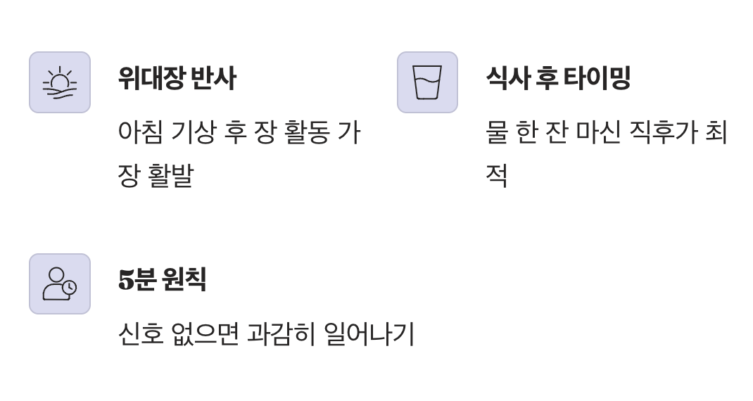 우리 몸은 아침에 일어났을 때 장이 가장 활발하게 움직이는 '위대장 반사'가 일어납니다. 아침 식사를 하거나 물을 한 잔 마신 직후가 화장실에 가기 가장 좋은 타이밍입니다. 이때 변의가 느껴지지 않더라도 일단 화장실에 가서 발판을 놓고 올바른 자세로 5분 정도 앉아있는 습관을 들이는 것이 좋습니다.