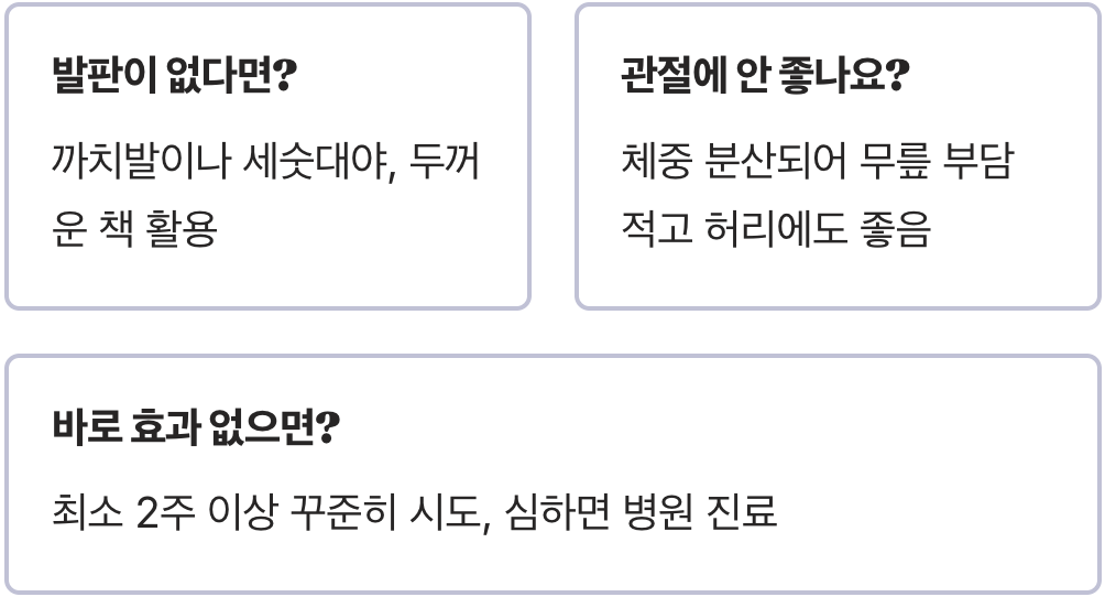 A. 전용 발판이 없다면 까치발을 들어 무릎 높이를 올리는 것도 임시방편이 될 수 있습니다. 또는 허리를 최대한 숙여서 가슴이 무릎에 닿을 정도로 몸을 접는 것도 치골직장근을 이완시키는 데 도움을 줍니다. 하지만 안정적인 자세 유지를 위해 집에 있는 세숫대야나 두꺼운 책을 받침대로 활용하는 것을 가장 추천합니다.