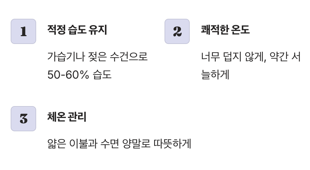 또한 방 안의 온도를 너무 덥지 않게, 약간 서늘한 듯 쾌적하게 유지하는 것도 중요합니다. 난방을 너무 세게 틀면 공기가 건조해져서 오히려 증상을 악화시킬 수 있기 때문입니다. 얇은 이불을 덮고 수면 양말을 신어 체온은 따뜻하게 유지하되, 코로 들어오는 공기는 상쾌하게 만들어주는 환경이 숙면을 돕고 치유 속도를 높여줍니다.