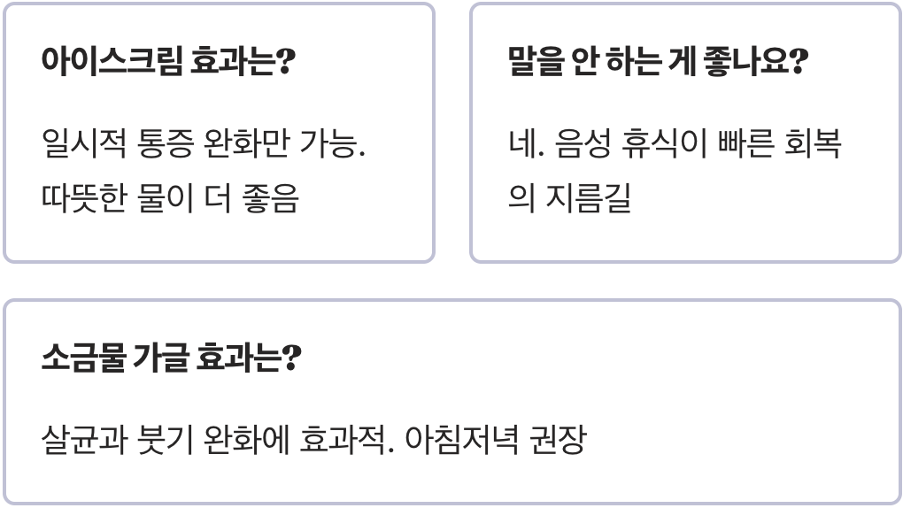 A. 따뜻한 소금물로 입을 헹구는 것은 입안과 목의 살균 작용을 돕고 붓기를 빼는 데 효과적입니다. 너무 짜지 않게, 우리 몸의 체액과 비슷한 농도로 미지근하게 만들어서 아침저녁으로 가글을 해주면 통증 완화에 큰 도움이 됩니다.