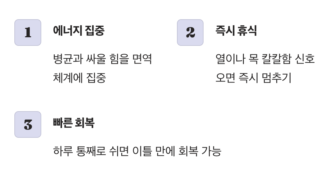 우리 몸은 하루에 쓸 수 있는 에너지가 정해져 있어서, 아픈 상태로 공부를 하거나 일을 하면 병균과 싸워야 할 힘이 엉뚱한 곳으로 분산되고 맙니다. 따라서 열이 나거나 목이 칼칼하다는 신호가 오면 하던 일을 즉시 멈추고 에너지를 오로지 면역 체계를 가동하는 데 집중시켜야 합니다. 아무것도 하지 않고 이불 속에 누워있는 것이 시간을 낭비하는 게 아니라, 치열하게 전투 중인 내 몸을 응원하는 가장 적극적인 행동임을 꼭 기억해야 합니다.