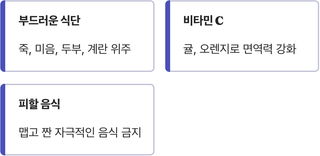 목이 아플 때는 음식물을 삼키는 것조차 고역이기에 소화가 잘되고 목 넘김이 부드러운 죽이나 미음을 드시는 것을 추천합니다. 맵고 짠 자극적인 음식은 염증 난 곳을 더 아프게 할 수 있으니 피하고, 대신 두부나 계란처럼 단백질이 풍부하고 부드러운 반찬 위주로 식사를 하세요. 잘 먹어야 낫는다는 옛말처럼, 입맛이 없더라도 영양분을 충분히 공급해 주어야 우리 몸의 군대인 백혈구가 힘을 낼 수 있습니다.