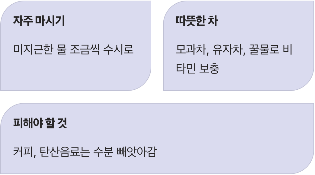 수분 섭취와 함께 충분한 수면·휴식이 목감기 회복을 빠르게 돕는 핵심이라는 내용을 정리한 글입니다.