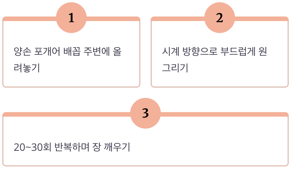 왜 하필 시계 방향일까요? 이는 우리 몸속 대장의 이동 경로와 일치하는 방향이기 때문입니다. 음식물이 소화되고 지나가는 길을 따라 부드럽게 밀어주는 효과를 주는 셈이죠. 약 20~30회 정도, 천천히 복부 전체를 마사지하며 잠들어 있던 장을 부드럽게 깨워주세요.