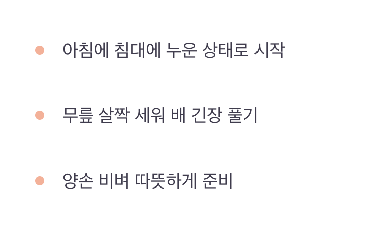 본격적인 마사지에 앞서, 몸과 마음을 편안하게 만드는 준비 과정이 필요합니다. 아침에 눈을 뜬 뒤, 바로 일어나지 말고 침대에 편안하게 누운 상태에서 시작하는 것이 가장 좋습니다. 무릎을 살짝 세워 배의 긴장을 풀어주면 더욱 효과적입니다.
